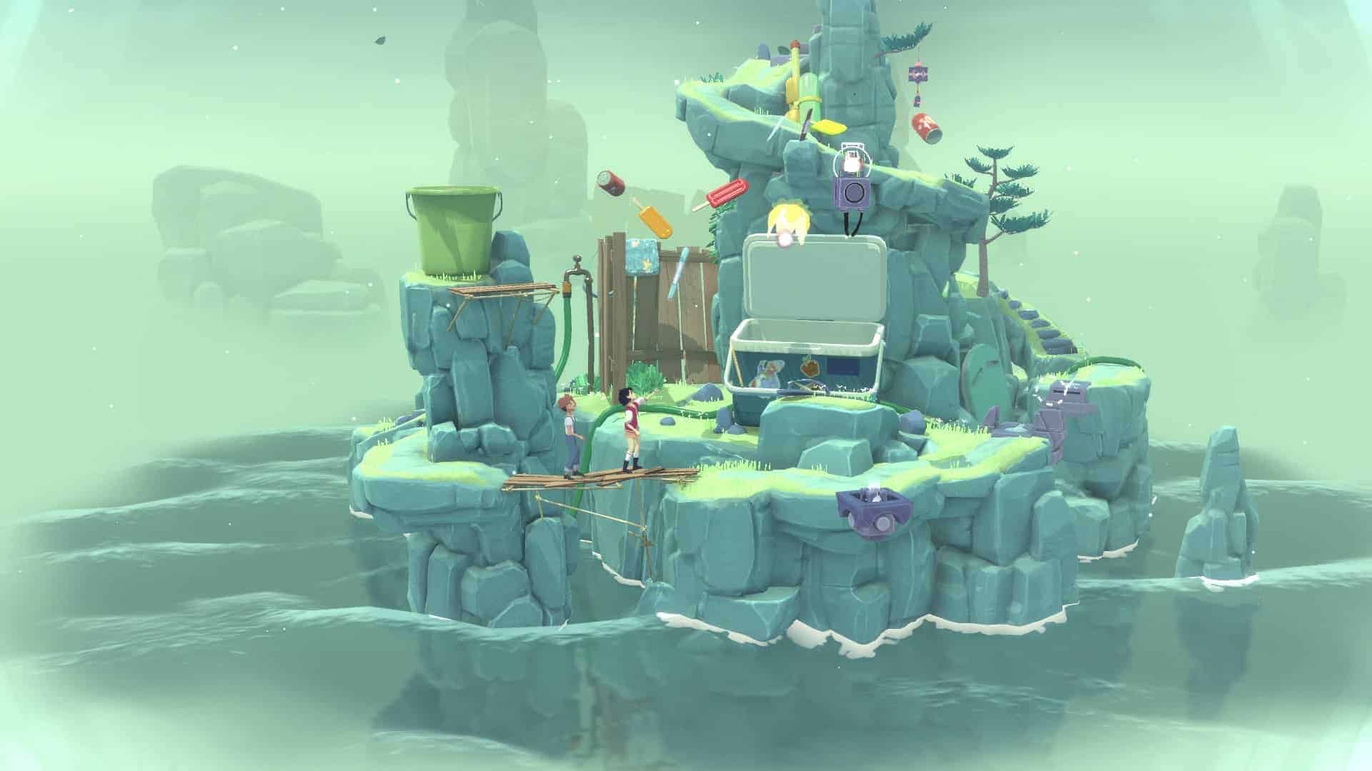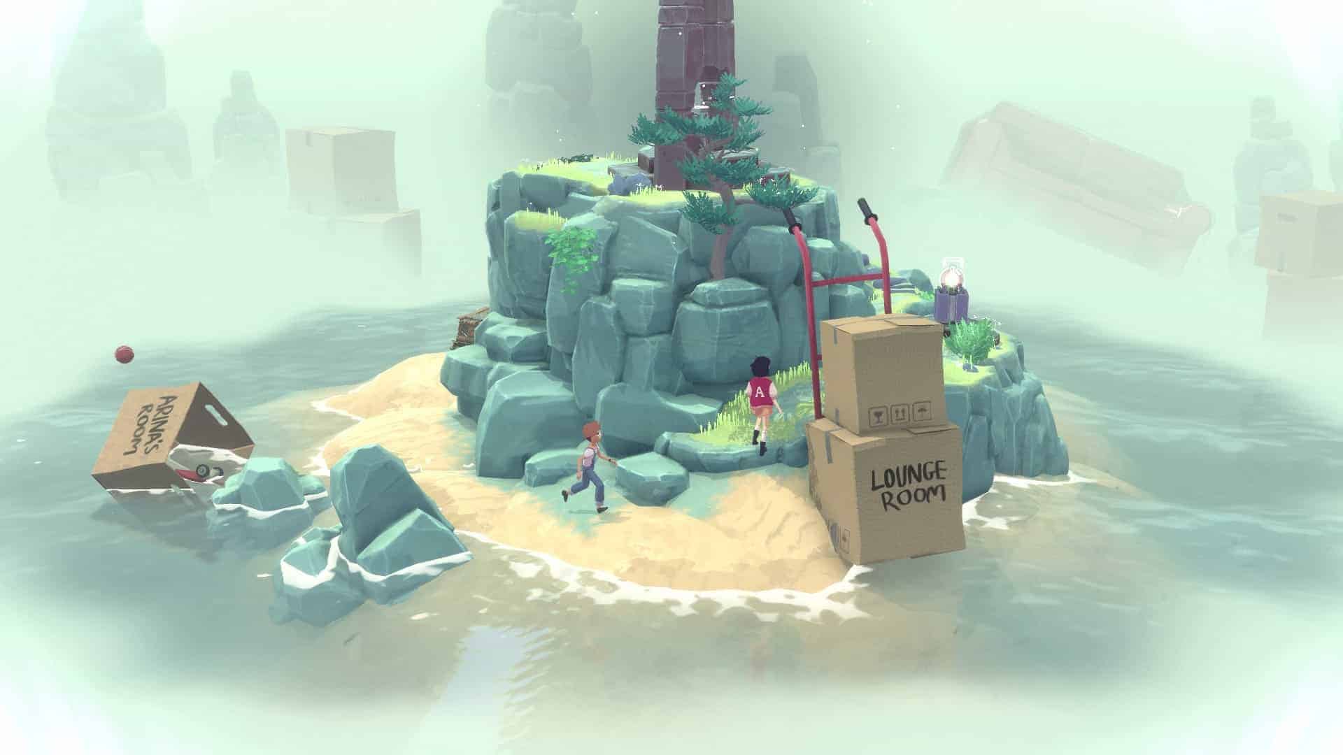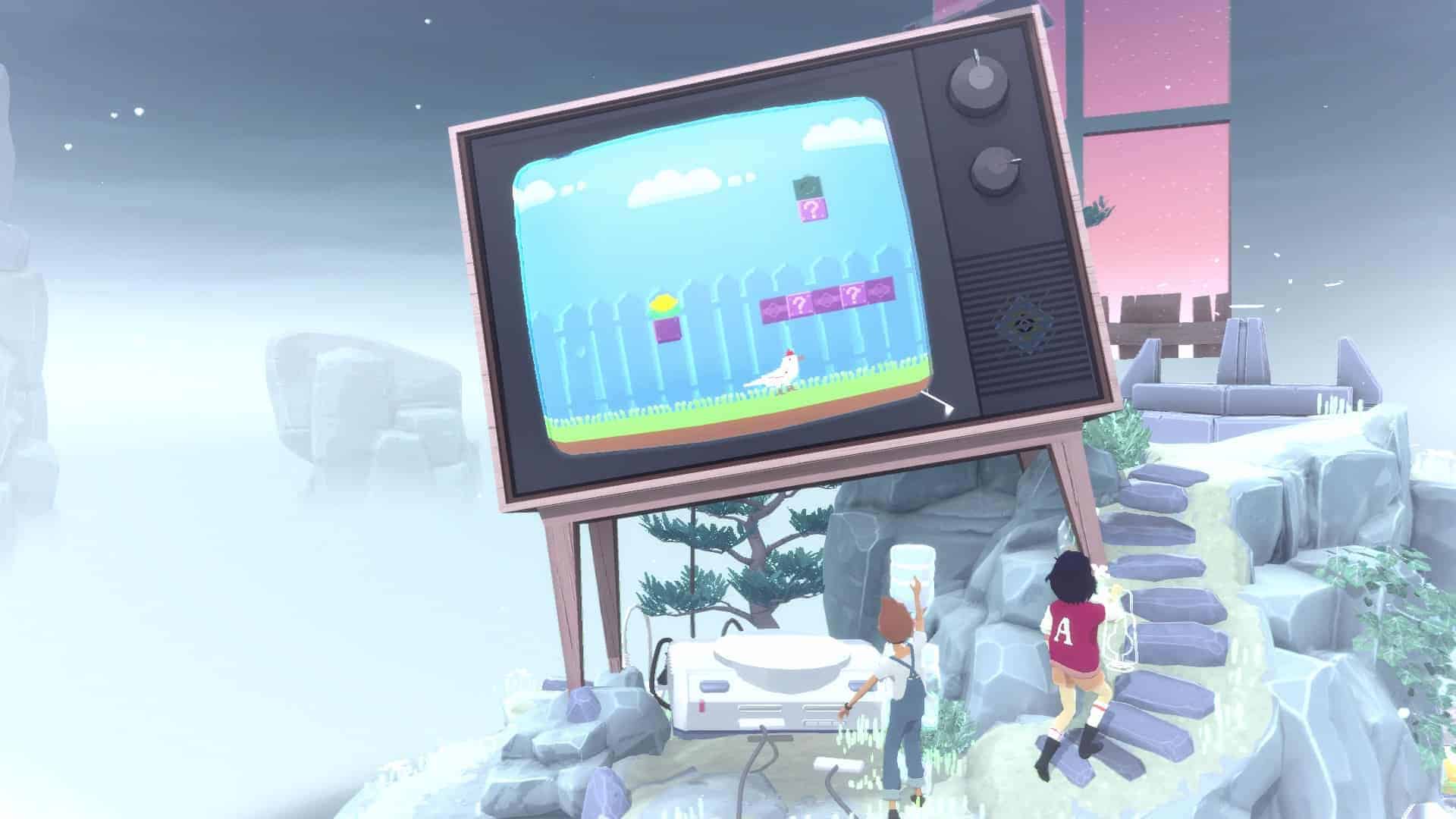 Un exemple sera peut-être plus parlant que mon explication bancale. Vos deux personnages disposent d’une orbe qu’ils doivent, pour rappel, poser au sommet de chaque île. Zut ! Une paroi trop élevée vous bloque le chemin. Mais, mais, mais… juste devant se trouve un lecteur VHS. Il se trouve qu’en avançant à un point précis dans le temps, le garçon va appuyer sur le bouton avance rapide du lecteur. Si vous vous arrêtez à ce moment précis (ce qui ne coule pas forcément de source), le lecteur va finir par recracher la cassette se trouvant à l’intérieur. Celle-ci va faire office de nouvelle plateforme vous permettant de franchir la paroi qui vous bloquait le passage. Voilà, c’est plus clair maintenant ? Oui ? Non ? Bon, tant pis. Notez simplement qu’il faut être très attentif à chaque événement qui se produit afin de réfléchir à la manière de l’exploiter, d’autant qu’une multitude de subtilités bienvenues s’ajoutent aux mécanismes de base.