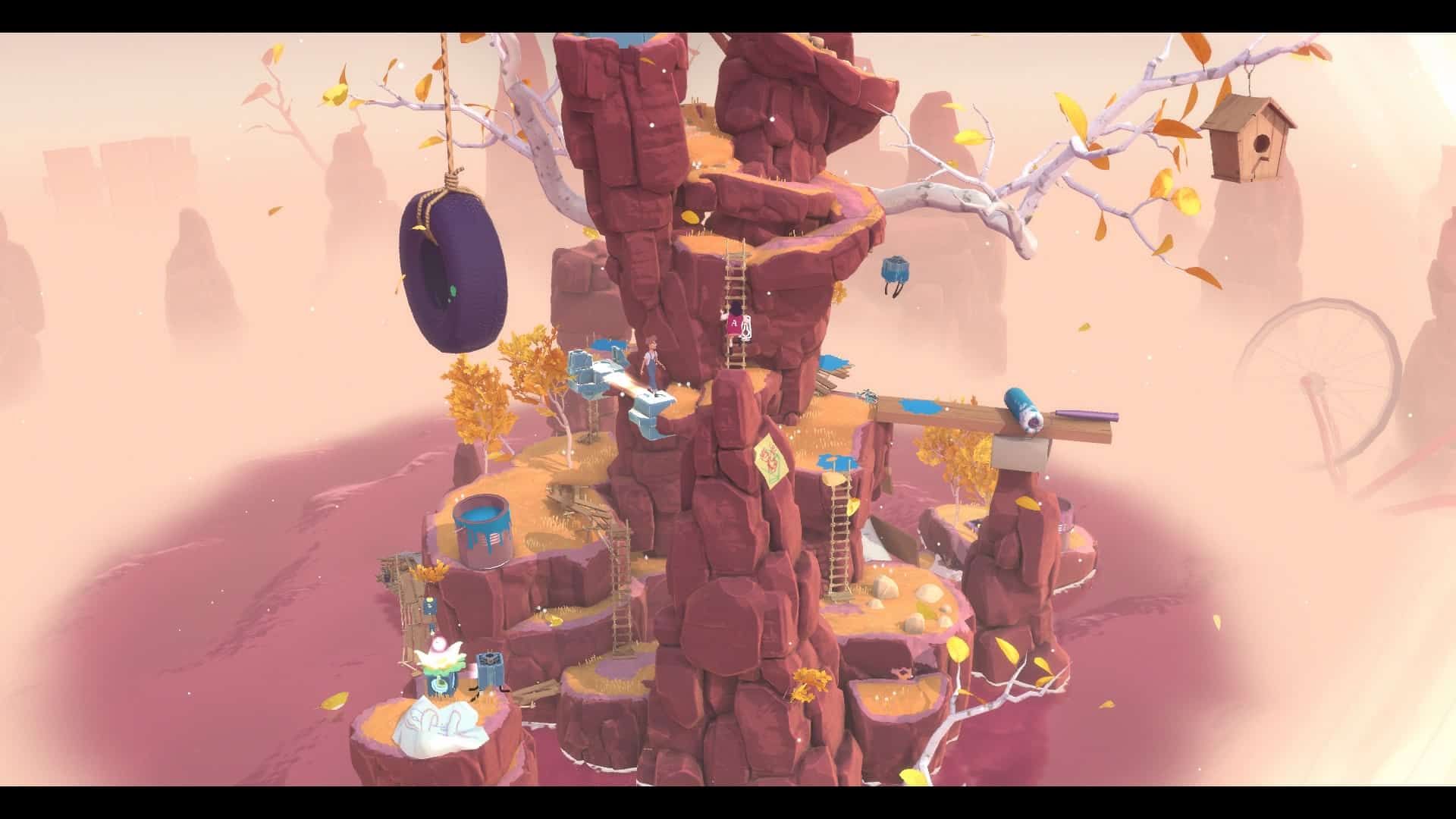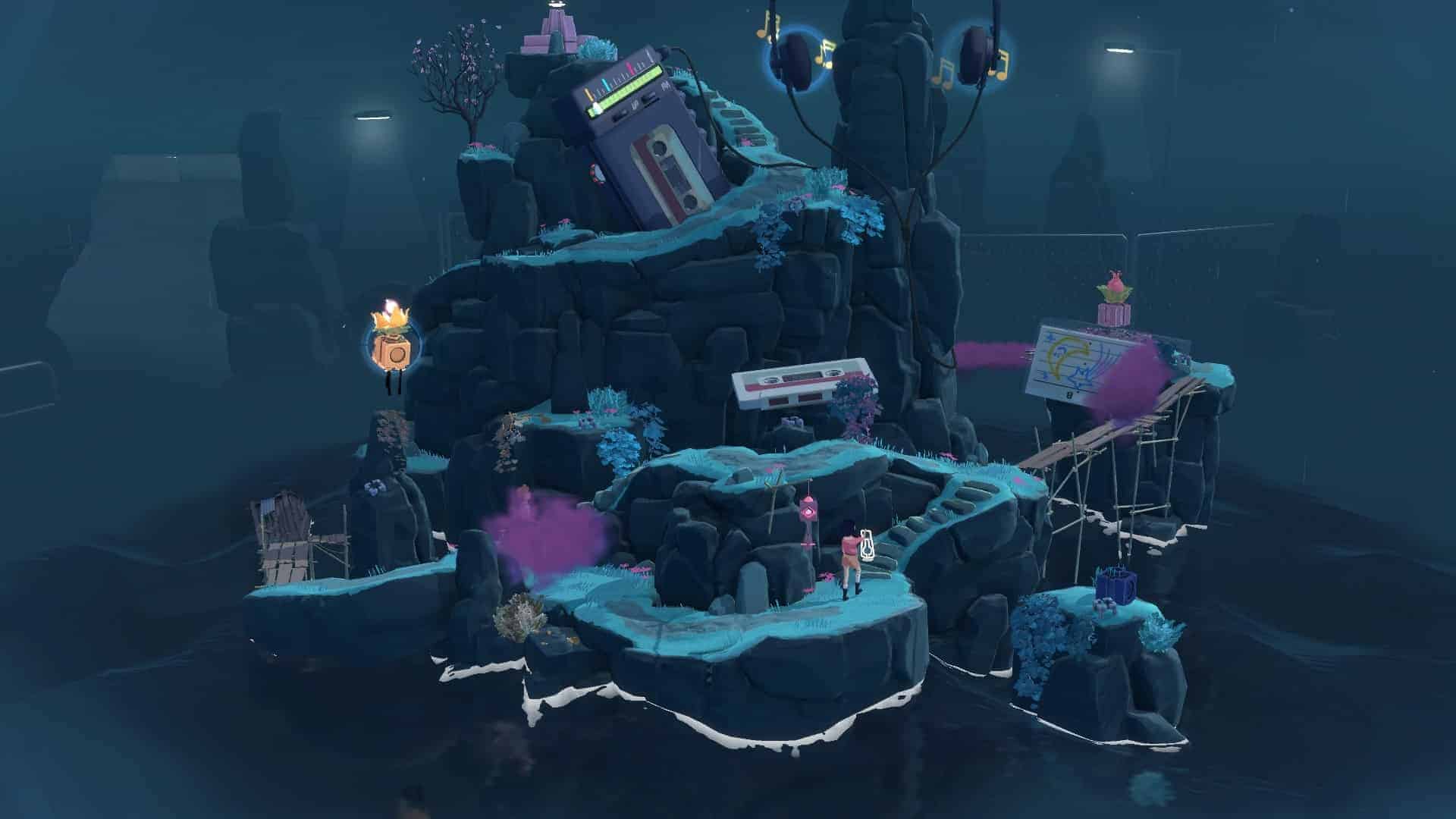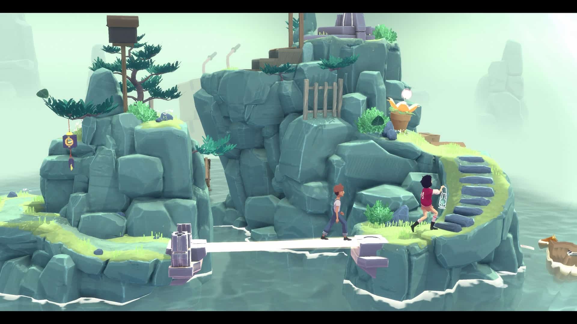 Un exemple sera peut-être plus parlant que mon explication bancale. Vos deux personnages disposent d’une orbe qu’ils doivent, pour rappel, poser au sommet de chaque île. Zut ! Une paroi trop élevée vous bloque le chemin. Mais, mais, mais… juste devant se trouve un lecteur VHS. Il se trouve qu’en avançant à un point précis dans le temps, le garçon va appuyer sur le bouton avance rapide du lecteur. Si vous vous arrêtez à ce moment précis (ce qui ne coule pas forcément de source), le lecteur va finir par recracher la cassette se trouvant à l’intérieur. Celle-ci va faire office de nouvelle plateforme vous permettant de franchir la paroi qui vous bloquait le passage. Voilà, c’est plus clair maintenant ? Oui ? Non ? Bon, tant pis. Notez simplement qu’il faut être très attentif à chaque événement qui se produit afin de réfléchir à la manière de l’exploiter, d’autant qu’une multitude de subtilités bienvenues s’ajoutent aux mécanismes de base.