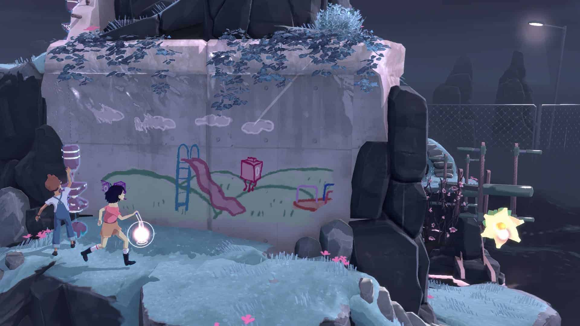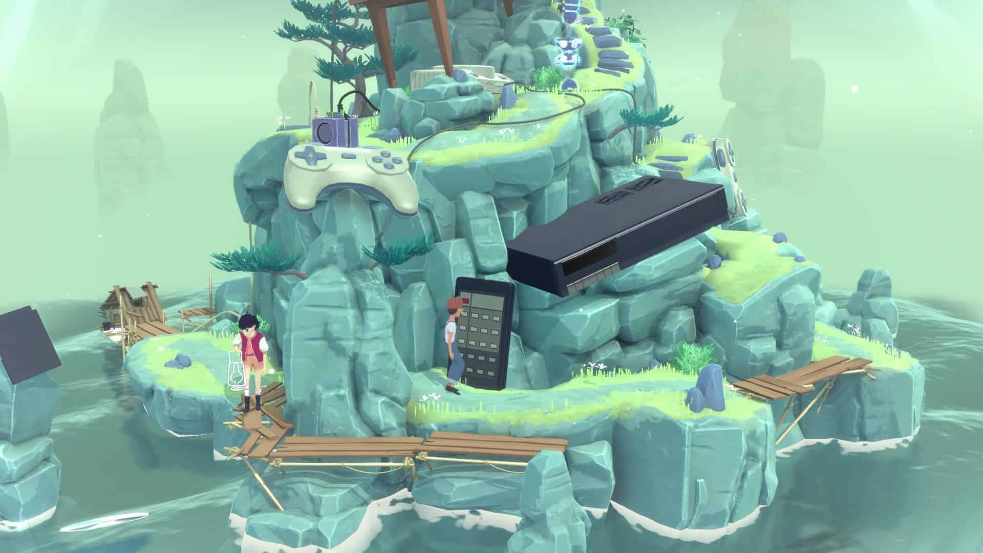 Pour bien visualiser The Gardens Between, imaginez une île. Situez-la dans un rêve surréaliste, avec des décors improbables – une cassette VHS géante, une console rétro, des tuyaux d’eau énormes, etc. On nage en plein rêve a priori incohérent qui pourtant repose sur une logique finement réfléchie (j’y reviendrai). Ça paraît simple mais les 4 années de gestation du jeu ont permis au studio indé de produire un rendu dont la simplicité n’a d’égale que sa beauté. L’aura qui s’en dégage n’est pas sans rappeler Monument Valley, autre puzzle-game dont l’ambiance onirique aura marqué les joueurs mobiles. Après tant de fleurs, je peux souligner quelques couacs mineurs, comme par exemple un aliasing à peine perceptible lors du zoom sur les protagonistes. Mais très sincèrement, je n’ai aucun reproche artistique à adresser à ce jeu qui titille savoureusement les sens.