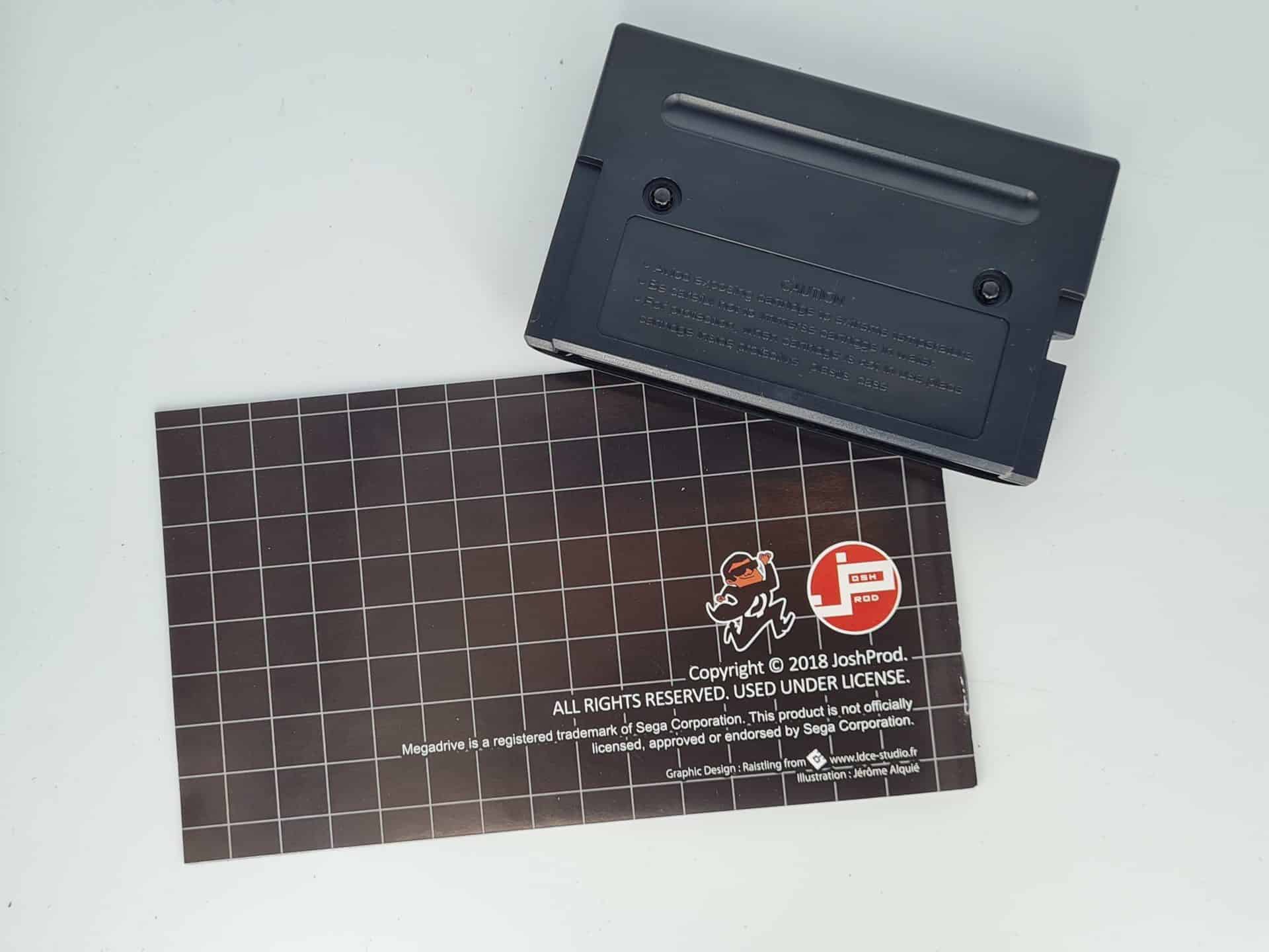Concernant la cartouche, elle n’est pas la même que son aïeul. Plus légère, pcb dure à insérer et encoche universelle sur le côté, elle s’offre le luxe de pouvoir intégrer les consoles de toutes les régions EURO, US et JAP. Le manuel est de très bonne facture et livre les explications rudimentaires et nécessaires avant d’entamer sa partie. Les us et coutumes d’antan sont respectés. Enfin, l’insert décoratif fait belle figure également, même s’il n’a pas le droit d’être estampillé Megadrive, il porte par la force des choses l’étendard PixelHeart.