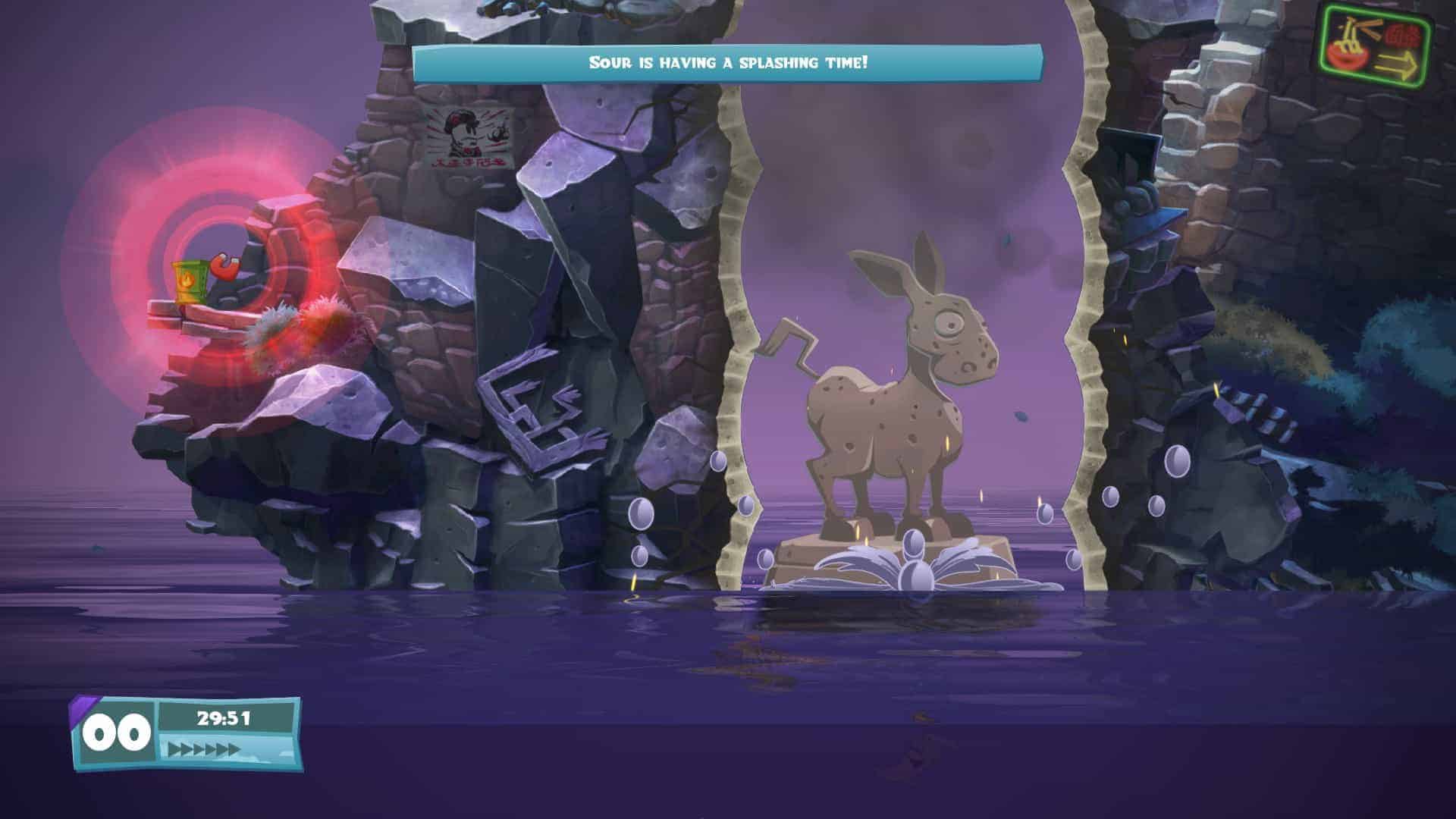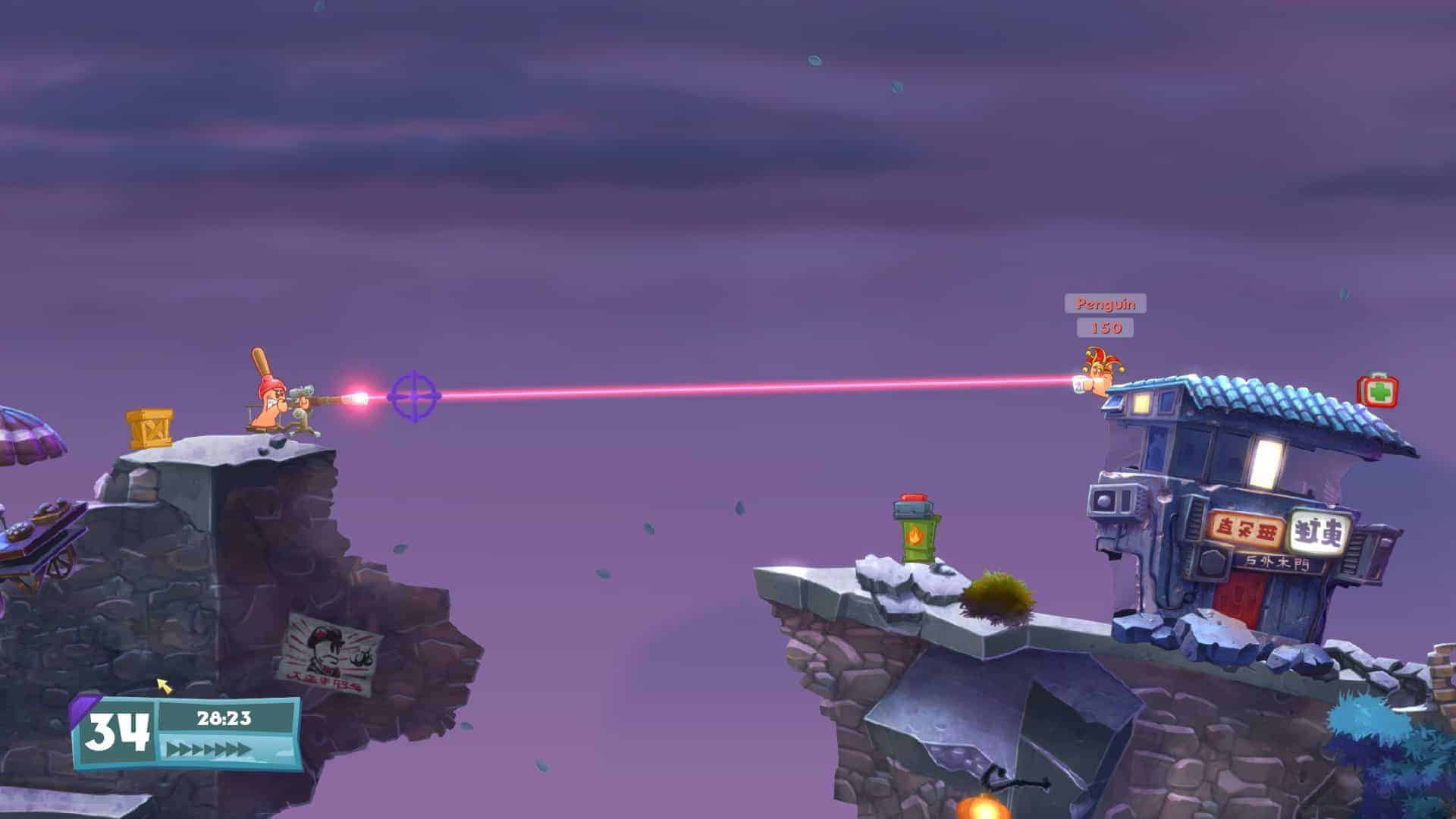 Comme je vous le disais, ce qu’on remarque tout de suite, c’est un retour aux fondamentaux dans cet épisode Worms W.M.D. Le mode solo, même si ce n’est pas le plus intéressant dans Worms, offre une belle durée de vie avec pas moins de 30 niveaux campagne, 20 d’entrainement et 10 de campagne bonus. Le tout avec des petits objectifs à remplir à chaque fois. Il ne faudra donc pas se limiter à éradiquer tous les vers ennemis.