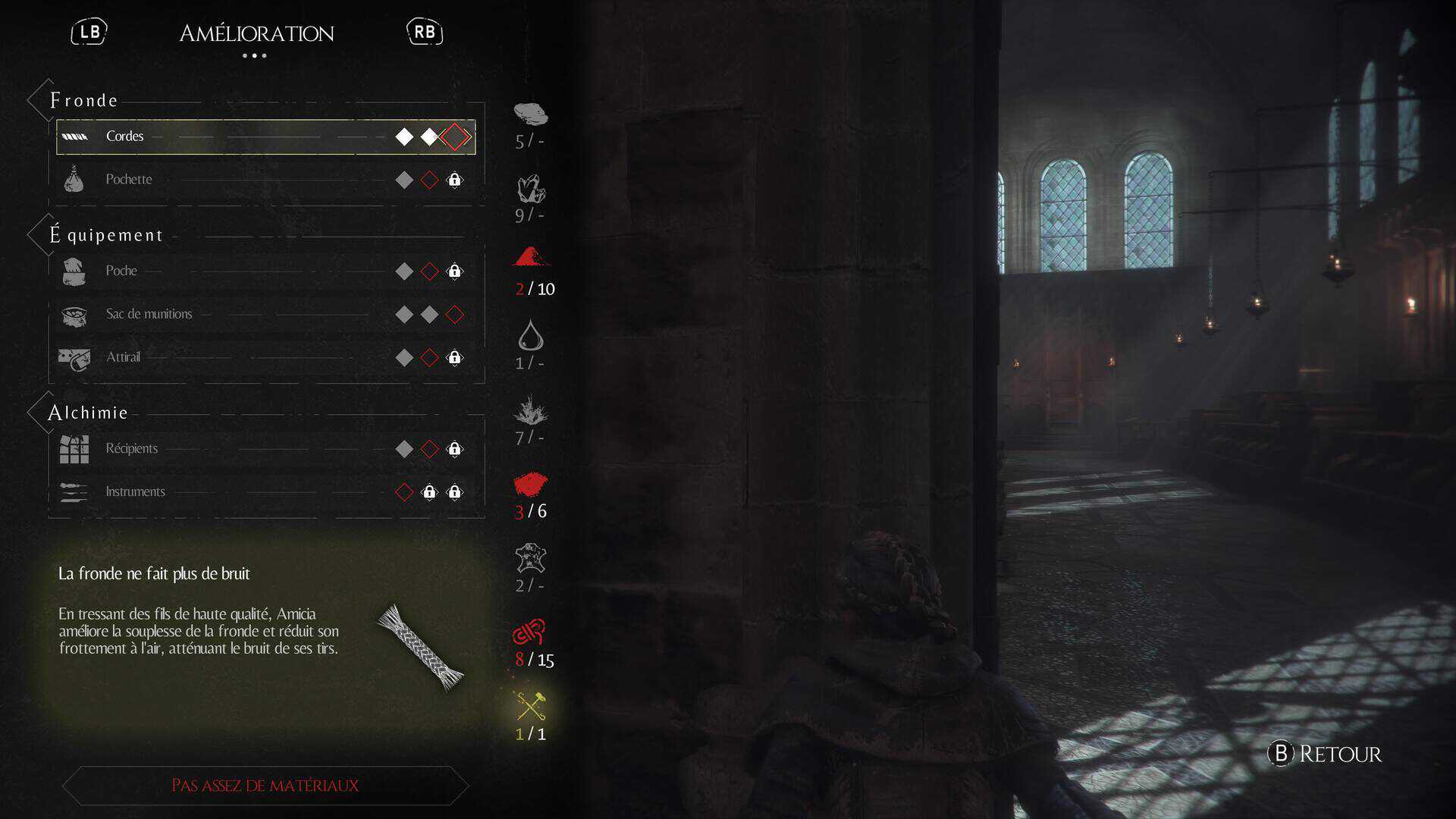 Votre progression dans l’histoire se fera en suivant le chemin qui vous est imposé, tout en axant ceci autour de phases d’infiltration où vous devrez échapper aux soldats de l’inquisition mais également des phases ou vous devrez trouver la parade pour faire fuir les rats et empêcher ceux-ci de vous dévorer vivant (littéralement et ce n’est pas beau à voir). Pour ce faire, vous disposerez d’une fronde pour seule arme et de diverses recettes alchimiques afin de brûler, endormir, attirer les rats… A vous donc de choisir ce qui conviendra le mieux et d’utiliser vos ressources avec parcimonie pour ne pas en manquer au moment opportun (même si je vous avoue qu’en règle générale celles-ci sont présentes en surabondance).