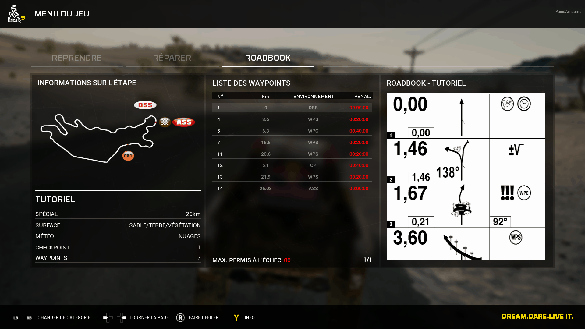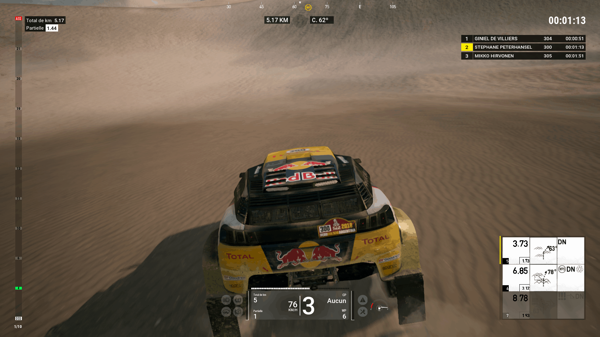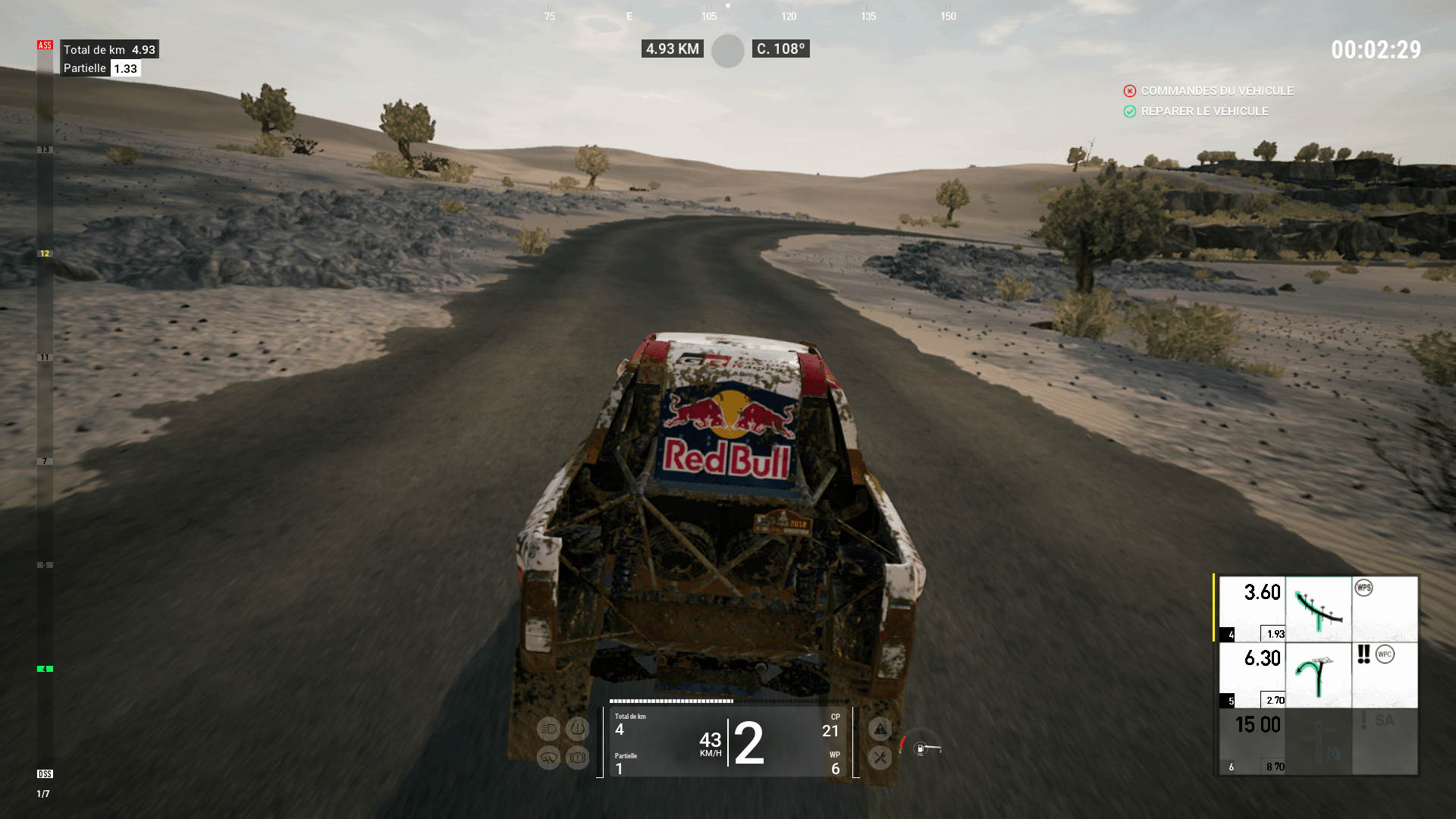 On commence alors par un tutoriel (obligatoire et en anglais seulement comme tout le reste d’ailleurs). C’est là qu’on découvre le système de waypoints et de navigation complètement propre au rallye raid. En effet, là où vous allez, il n’y aura bien souvent pas de route (la route, quelle route…bon ok je sors) et il faudra suivre des caps et autres objets sur le parcours afin de vous orienter. Je ne connaissais pas vraiment et je vous avoue que c’est super bien fait et déroutant à la fois. Vous entendre dire : cap 268 degrés avec les palmiers sur la droite…Si vous ne voyez pas les palmiers, vous êtes perdus.