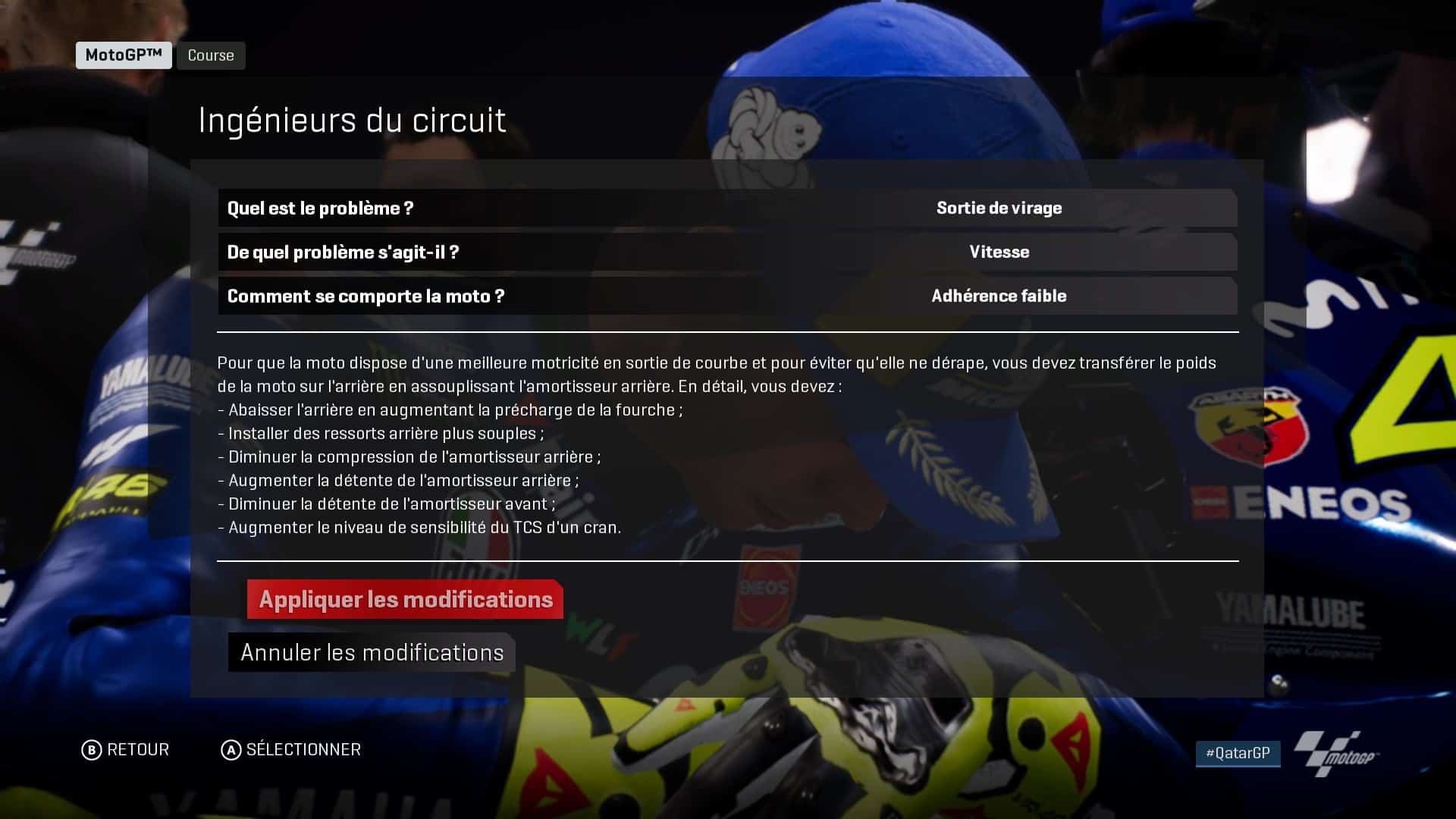 A ce niveau-là, je dois dire que c’est franchement impressionnant. On se rend compte que c’est bien là-dessus et sur le tracé des circuits que Milestone a mis le paquet. Les sensations sont immédiates et hyper bonnes, on ressent de suite la moto. Que vous soyez novice ou expert, la quantité impressionnante d’options d’aide à la course permettra de jouer selon votre niveau. J’ai pour ma part adoré l’apport de l’ingénieur de piste. Celui-ci vous aidant à améliorer (et donc de comprendre) les paramètres de votre moto en répondant à de petites questions qui permettront à votre ingénieur de vous conseiller pour tel ou tel réglage.