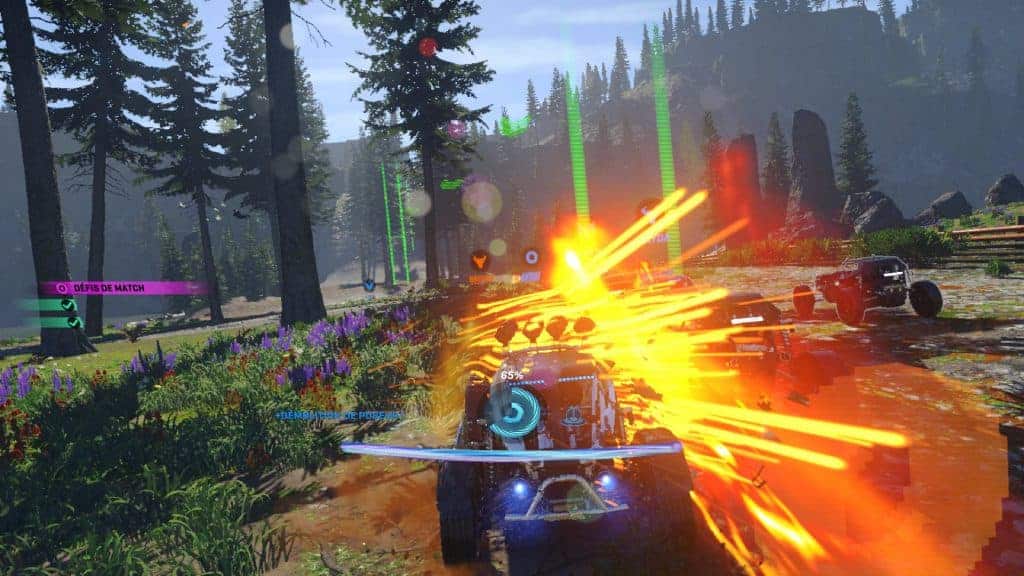 Ainsi, certains véhicules seront capables de laisser une traînée de turbulences derrière eux, d’absorber tout le boost des ennemis, de gagner du boost en faisant des figures et bien d’autres choses encore. Ce qui offre une dimension presque stratégique au jeu car votre rôle sera différent en fonction de vos aptitudes et surtout du style de partie choisi. En gros comme le dit la bande annonce, Onrush c’est : « Foncez, détruisez, recommencez » et ça, on adore.