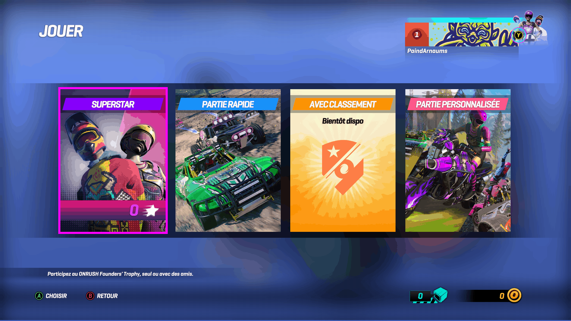 Onrush est un jeu diaboliquement fun qui vous plonge immédiatement dans la partie. Résolument arcade, la prise en main se fait immédiatement, ce qui permet au joueur de directement se prendre au jeu. Vous aurez le choix entre plusieurs modes au début de la partie. Superstar qui n’est autre qu’une sorte de mode carrière où vous aurez la possibilité de faire différentes épreuves pour gagner des points, des améliorations pour vos véhicules ou encore des modifications pour vos personnages. Il y a également un mode partie rapide où vous pourrez affronter d’autres joueurs en ligne, un autre avec classement qui n’est malheureusement toujours pas disponible et enfin, un mode partie personnalisée pour créer votre propre partie.