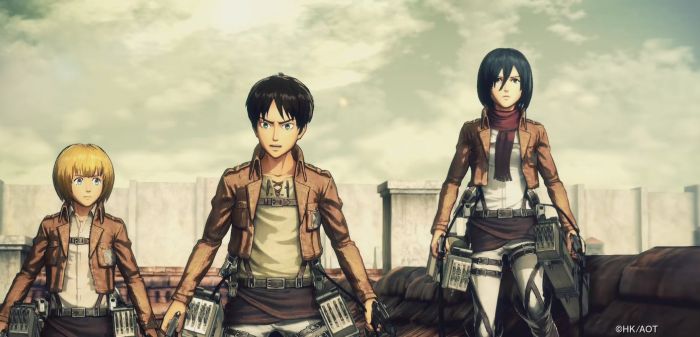 À partir d’ici je ne peux en aucun cas vous garantir de ne pas vous spoiler l’histoire, tout du moins le début. C’est d’ailleurs l’une des première critique que je ferais au jeu. Trop d’infos, trop vite ! Je me suis essayé au jeu durant un peu moins de 4h et au niveau de l’histoire j’en suis déjà à la moitié de la série. Le soucis c’est qu’ici durant 4h ce n’est pas que de l’histoire, sachant que les 3/4 du temps j’étais occupé à jouer pour casser du Titan. Si l’on combine les cinématiques entre les phases de gameplay, j’ai du voir approximativement 30min à tout casser. Ils sont donc arrivés à résumer 14 épisodes de 20min (4h40 pour ceux qui calculeraient encore) en seulement 30 minutes de cinématiques. Je vous laisse imaginer le carnage d’un point de vue intrigue. Bien sûr pour ceux qui ont déjà vu l’anime cela n’est pas un problème, que du contraire c’est cool d’avancer vite vers les scènes importantes qui nous permettent de revivre ce manga, manette en main. Mais pour les autres, vous n’aurez même pas le temps de vous attacher aux personnages qu’ils commenceront déjà à mourir.