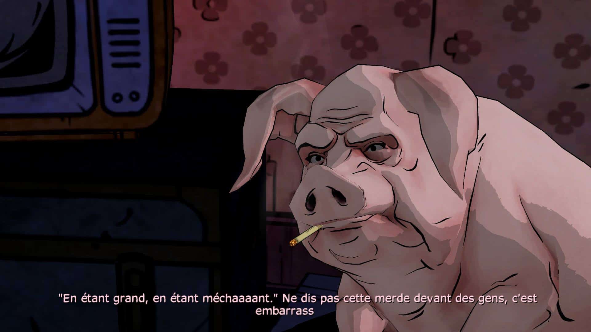 Vous incarnez donc « Big Bad Wolf » alias « BigBy » – le grand méchant loup – dans une aventure glauque, à contrecourant des contes auxquels elle fait de nombreuses références. Moi qui découvre le comic en même temps que le jeu, je dois dire que j’ai été séduit par l’atmosphère crade, dérangeante et inattendue des lieux. L’aventure captivante, bien rythmée et pleines de personnages aux traits marqués passe un peu trop vite. La réalisation graphique soignée donne l’impression de piloter une bande dessinée vivante et l’espèce de cel-shading bénéficie d’un rendu absolument magnifique à l’écran. L’aide de la TTTGTradTeam m’a tout de même été précieuse pour appréhender le niveau d’anglais un poil exigeant, notamment au niveau des jeux de mots et des références tout au long de l’histoire. If you know what I mean…