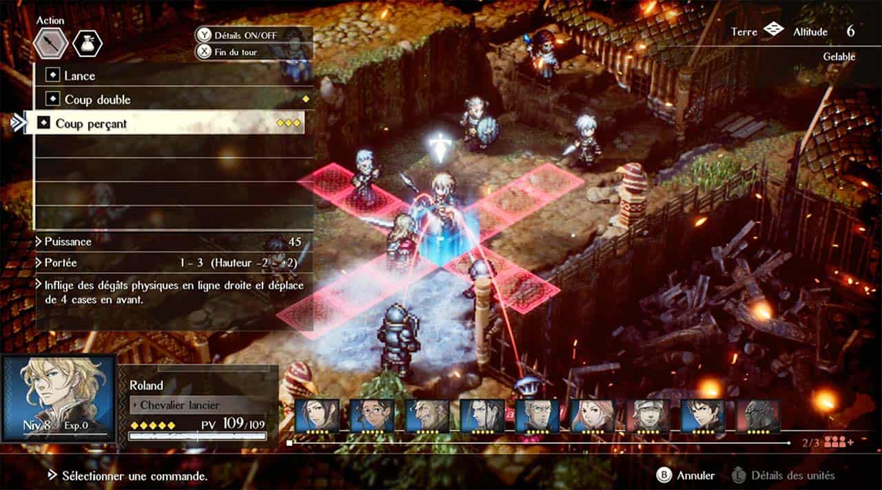 On pourra donc faire la connaissance de tout ce petit monde au travers de phases d’exploration assez anecdotiques dans lesquelles il s’agira de convaincre nos alliés de nous suivre dans nos décisions. Mais ne vous y méprenez pas, Triangle Strategy est avant tout un Tactical RPG qui fait la part belle aux combats. Si ce genre vous est inconnu, sachez qu’il consiste à déplacer les membres de son escouade au tour par tour sur une zone quadrillée et d’affronter une équipe adverse. L’originalité de ce système de combat est qu’il tient compte de la topographie du terrain, mais aussi des conditions climatiques. Comprenez par là qu’un archer fera plus de dégâts si vous le placez en hauteur ou qu’un sort de feu influencera le déplacement des personnages sur un terrain enneigé. À noter que chaque personnage possède des capacités qui lui sont propres et que le tout peut devenir rapidement très stratégique.