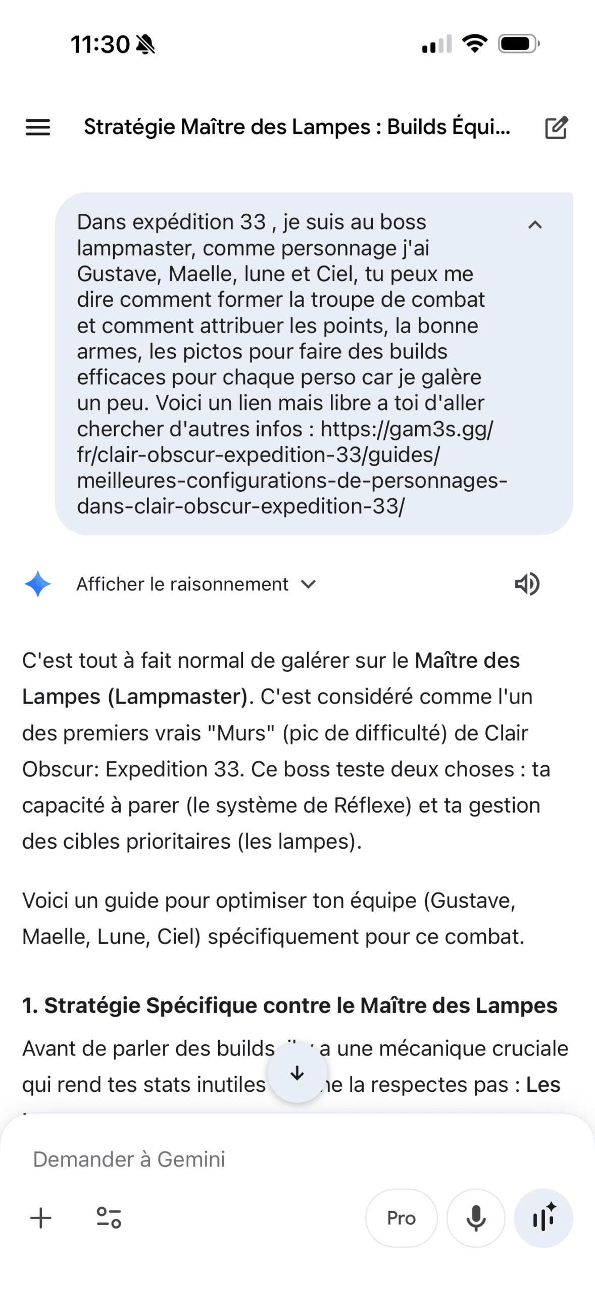 Ce boss a été un véritable mur. Mes attaques lui faisaient l’effet d’une piqûre de moustique, et lui renvoyait mon équipe au tapis en deux tours. J’avais beau essayer de changer de tactique, rien ne passait. C’est là que j’ai ouvert mon prompt : “Je suis bloqué, mes dégâts sont ridicules, aide-moi à comprendre mes persos”.