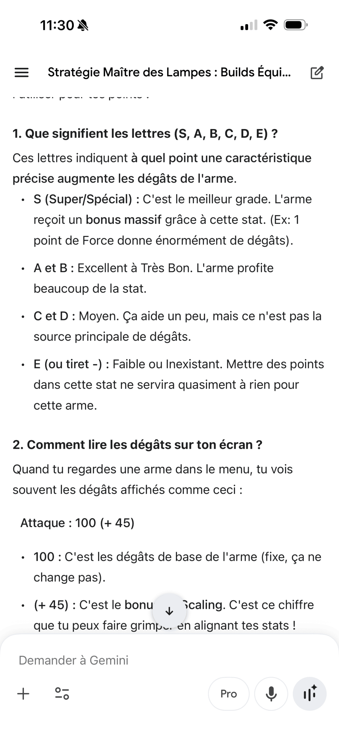 L’IA n’a pas juste recraché une soluce. Elle a agi comme un theorycrafter personnel. Elle a immédiatement pointé du doigt mon erreur fondamentale : le Scaling. J’avais totalement ignoré les petites lettres (S, A, B) à côté de mes armes. Je jouais mon personnage principal avec de la Force alors que son arme scaliait sur… la Vitalité. En gros, plus il avait de PV, plus il tapait fort. Une mécanique contre-intuitive pour mon cerveau de guerrier basique, mais logique pour l’IA.