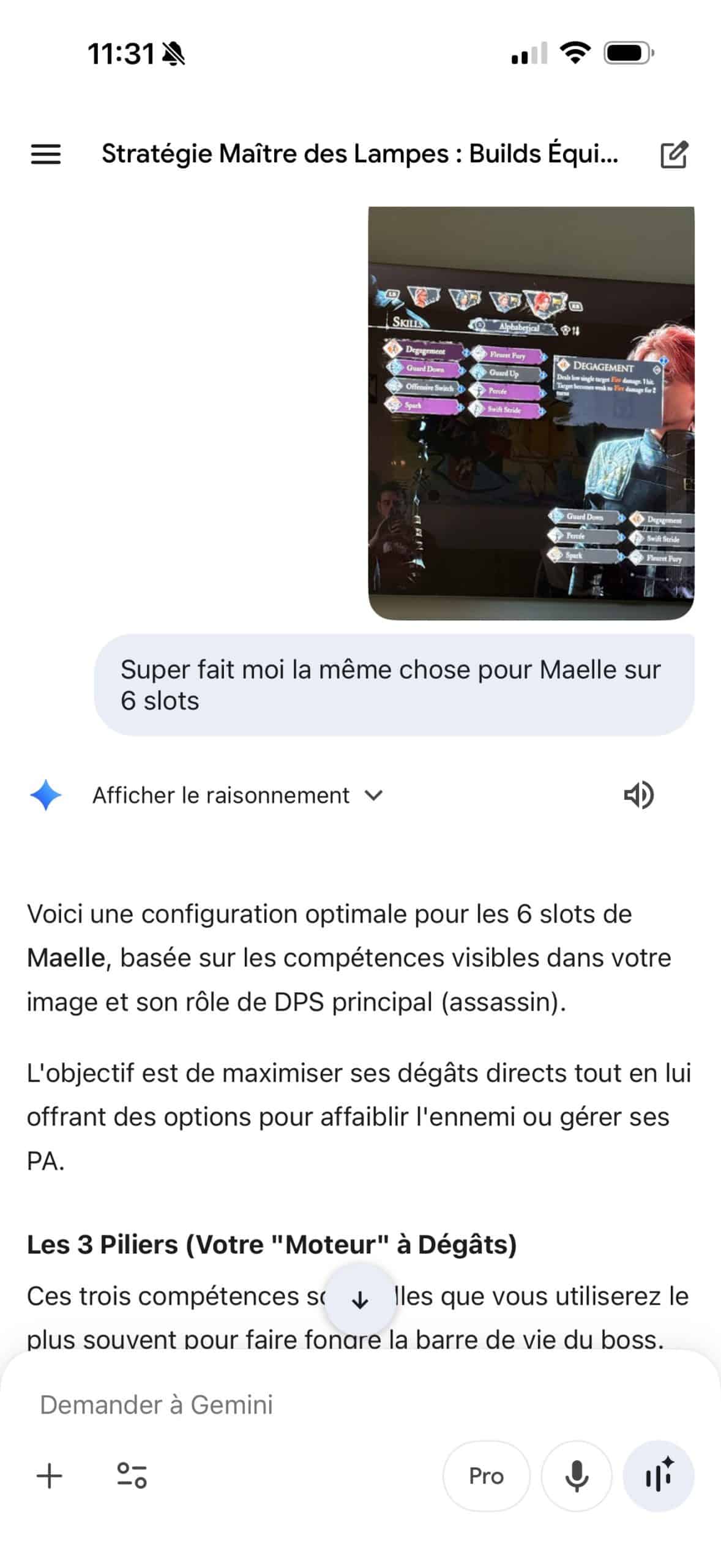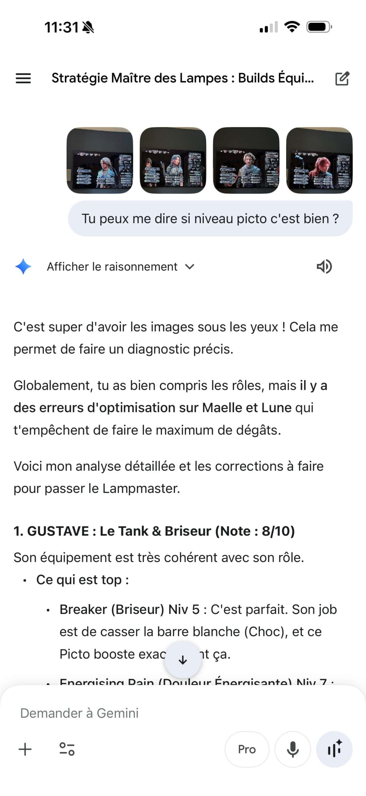 J’ai donc fait des captures d’écran de mes menus et je les ai envoyées à l’IA. En quelques secondes, elle a analysé chaque ligne de texte. Elle a immédiatement repéré une aberration : j’avais équipé un Picto “Stagger” sur Maelle, alors que son build ne profitait absolument pas de cette stat. “Enlève ça, c’est une place perdue”, m’a-t-elle dit (en substance).