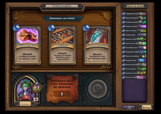 Après chaque partie, vos points de vie seront augmentés, peu importe si vous avez gagné ou perdu. Il sera également possible d’améliorer votre deck en choisissant un ensemble de cartes parmi les 3 propositions classées par thèmes. Vous pourrez aussi choisir l’un des trois trésors bonus qui seront très puissants lors de vos prochaines parties !