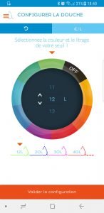 Avant d’utiliser le Hydrao Shower First pour la première fois, il faudra installer l’application Hydrao Smart Shower et ensuite simplement activer le bluetooth. L’appairage entre votre smartphone et la douche se fait de manière automatique et hyper rapide, il ne faut rien faire d’autre que de lancer l’application. Celle-ci vous demandera d’abord de prendre une douche de référence afin de voir votre consommation classique. Pendant la douche, le pommeau restera vert tant que vous restez sous le seuil des 10L, bleu pour les 20L, violet pour les 30L, rouge pour les 40L et ensuite clignotera une fois ce palier franchi pour vous avertir de votre grosse consommation d’eau. Le pommeau fonctionne sans piles et les LEDs seront alimentés par la force de l’eau, vraiment pratique.