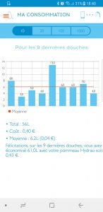 Après la douche vous aurez la possibilité de configurer vos propres couleurs pour les différents seuils mais aussi de mettre un objectif de réduction de votre consommation. L’app enregistre jusqu’à 1000 douches pour vous montrer vos courbes de consommation. Il faut donc bien le dire, Hydrao Shower First n’est pas un pommeau de douche qui vous fait directement économiser de l’eau. Ce dernier vous montre ce que vous consommez et vous invite à changer vos habitudes. Je trouve intéressant de réaliser ce que l’on consomme sur une année et surtout ce que cela nous coûte. L’utilisation des couleurs est fun et éducative à la fois. Quand j’ai montré cela à mes deux filles, celles-ci avaient immédiatement envie de l’essayer. Notez qu’il ne faut pas systématiquement avoir votre smartphone sur vous vu que le pommeau dispose d’une mémoire interne capable d’enregistrer jusqu’à 200 douches.