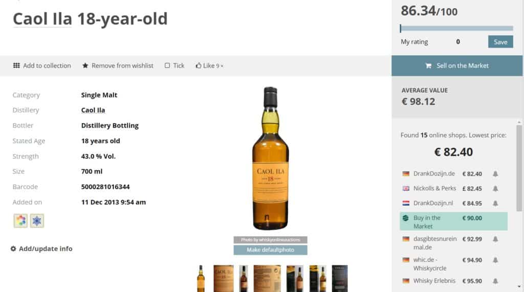 Mais cette application ne serait pas aussi idéale si en plus de tout ça, elle ne vous informait pas sur le prix moyen de la bouteille recherchée. Elle affichera donc le prix vendu sur le marché par certains ou alors des liens vers les boutiques les moins chères. Parfait afin de comparer et bien souvent de dénicher des whiskies 10-15 euros moins chers que dans des magasins normaux. J’en profite pour vous dire que l’Allemagne et les Pays-Bas disposent bien souvent des tarifs les plus avantageux.
