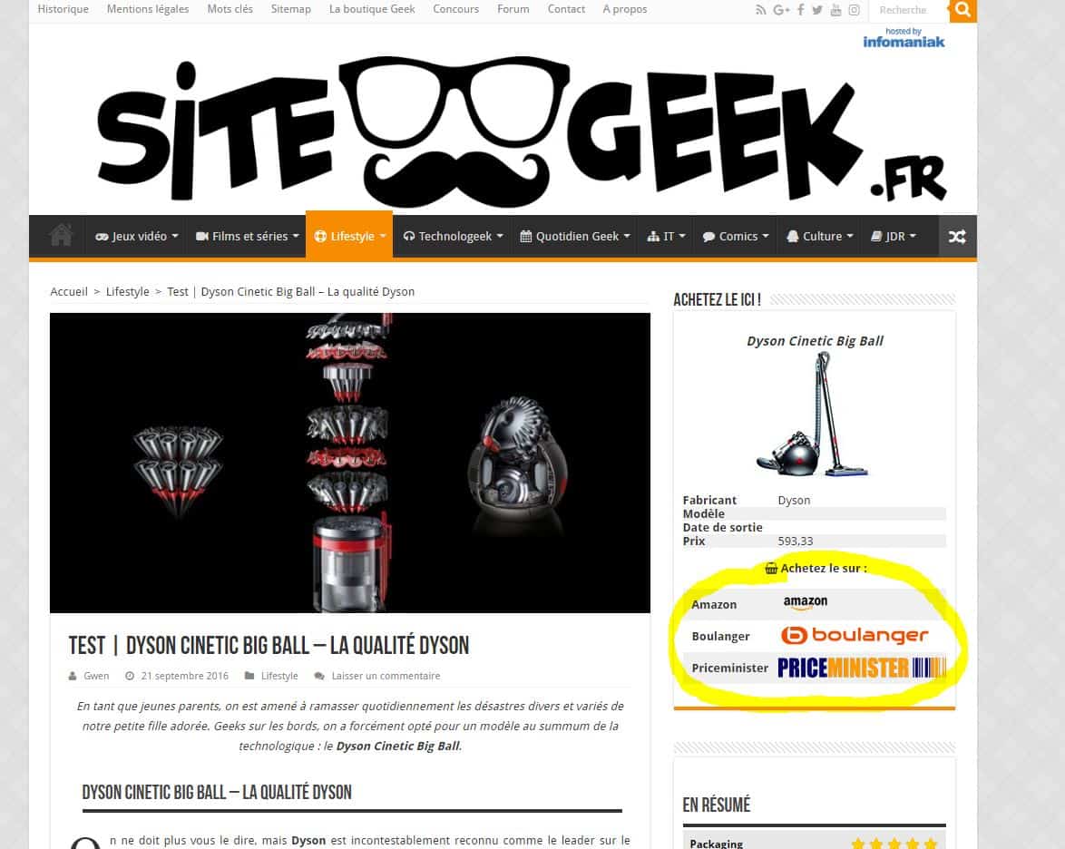 Largement popularisée par Amazon, la pratique de l’affiliation est maintenant très répandue. En gros, lorsque vous évoquez un ou des produits sur votre site, vous fournissez des liens boutiques permettant à l’internaute d’acheter le produit. Via un système de tracking, le revendeur vous identifie et chaque mois vous obtenez une rémunération. La méthode de calcul dépend de la plateforme choisie et si les concepts webmarketing ne vous effraient pas, vous trouverez un article du guide digital 1and1 expliquant plus en détails le fonctionnement de l’affiliation. Sur Sitegeek, on a des comptes partenaires avec Amazon, Gearbest, Micromania, Boulanger et Priceminister pour lesquels nous gagnons un pourcentage (5% généralement) sur les ventes générées. Cette méthode me plait beaucoup, car je trouve que ces liens complètent de façon intéressante un test produit pour les lecteurs et que ces boutiques proposent des offres compétitives.