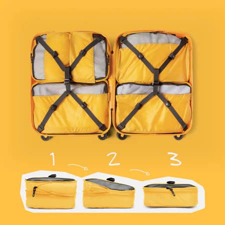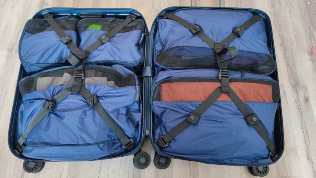 Pour les besoins de ce test et vu que je n’ai pas de voyage prévu dans l’immédiat, je me suis livré à l’exercice de faire ma valise pour une semaine au ski. Comme vous pouvez le voir sur ma photo, l’ensemble rentre parfaitement sans forcer et je pourrais certainement encore ajouter une veste ou une paire de chaussures en poussant un peu. Le tout est bien maintenu grâce aux pochettes de rangement mais aussi aux attaches sur celles-ci qui se fixent sur la sangle de la valise. Plus aucun risque de retrouver vos affaires sens dessus dessous dans votre valise.